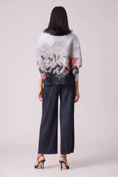 Black top featuring a boat neck and batwing sleeves with an art deco floral print. Paired with pleated straight pants in a matching hue.