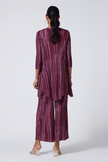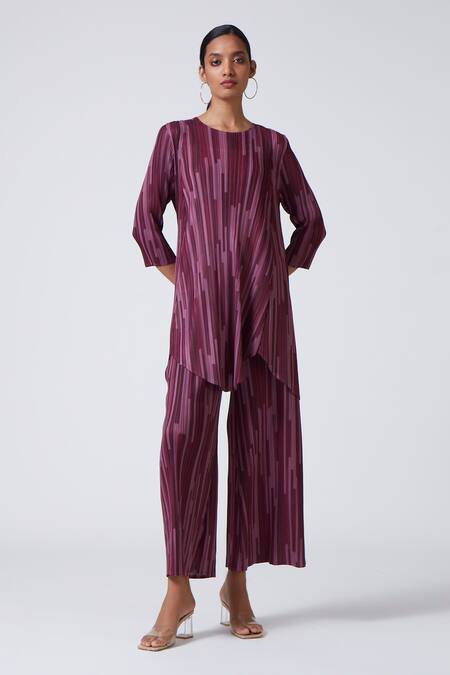 Wine 100% Polyester Stripe Round Anika Printed Pleated Top And Pant Set