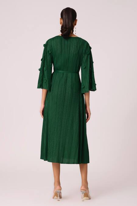 Green A-line midi dress featuring micro pleat details and 3D floral embellishments on the sleeves. Comes with a matching belt for added definition.