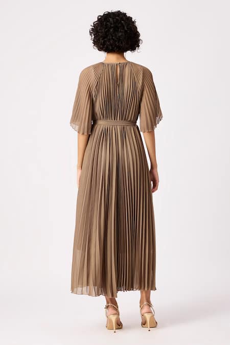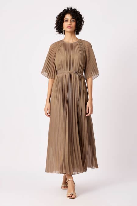 Brown Polyester Round Neck Ariel A-line Pleated Dress