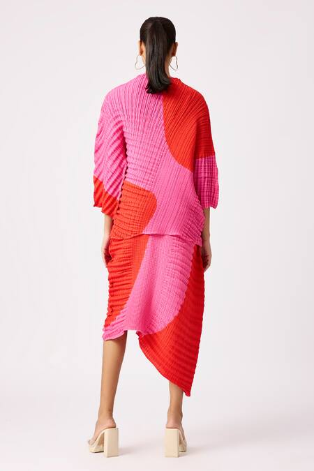 Red Polyester High Neck Aspen Colorblock Pleated Top And Skirt Set