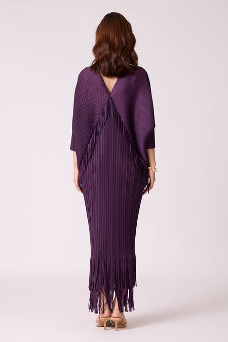 A wine purple midi dress crafted from a poly-satin-blend fabric, featuring a pleated texture, batwing style sleeves, and fringe details along the V-neckline and hem.