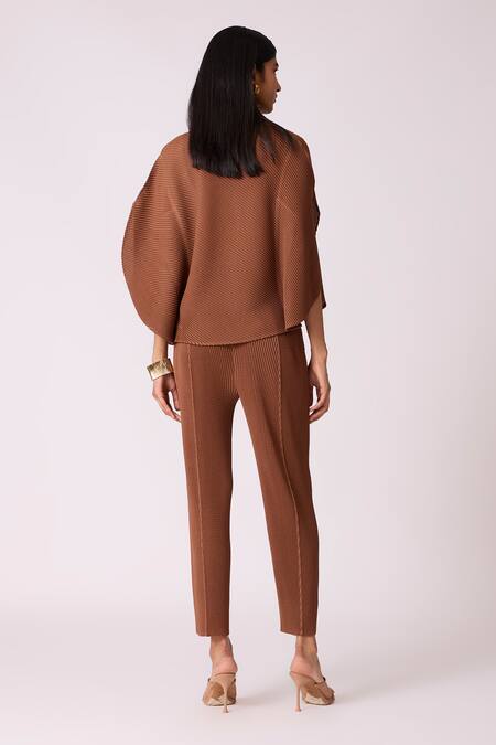 A brown kaftan-style top crafted from 100% polyester, featuring a pleated texture and flowy silhouette. It is paired with matching brown straight-leg pants, also in a pleated texture.