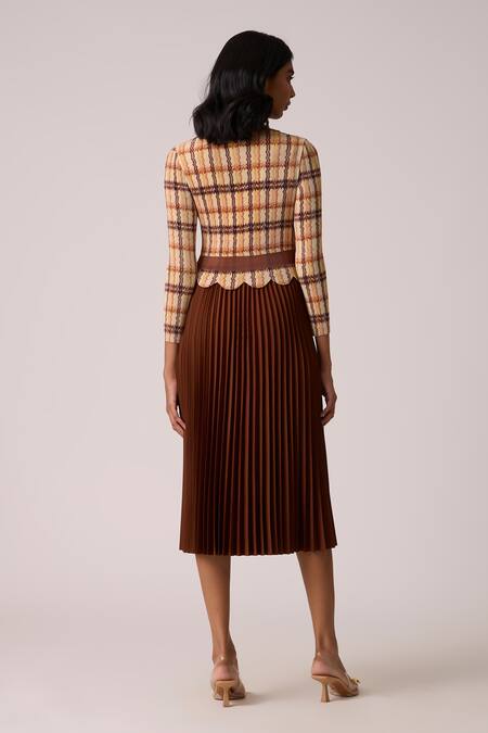 A brown dress crafted from 100% polyester, featuring a gingham patterned bodice with a scalloped waistline and a pleated midi skirt.