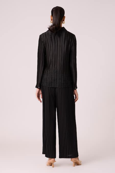 Black shirt featuring micro pleat details and cutwork at the bottom