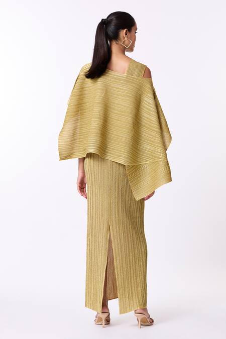 Gold Polyester Asymmetric Metallic Cape Dress With Sashe
