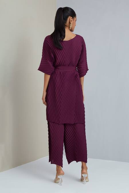 Grape purple high low tunic with chevron pleated detailing & round neck. Paired with chevron pleated pant & tie-up belt.
