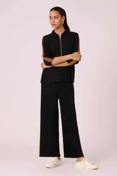 Black Polyester Collared Maude Zipper Top With Straight Pant
