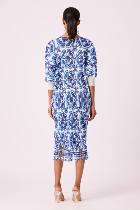 Fringe detailing at the hem, Puffed smocked sleeves, Pleated printed pattern
