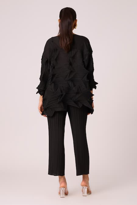 Black Polyester Round Neck Mona 3d Pleat Detailed Top With Pant