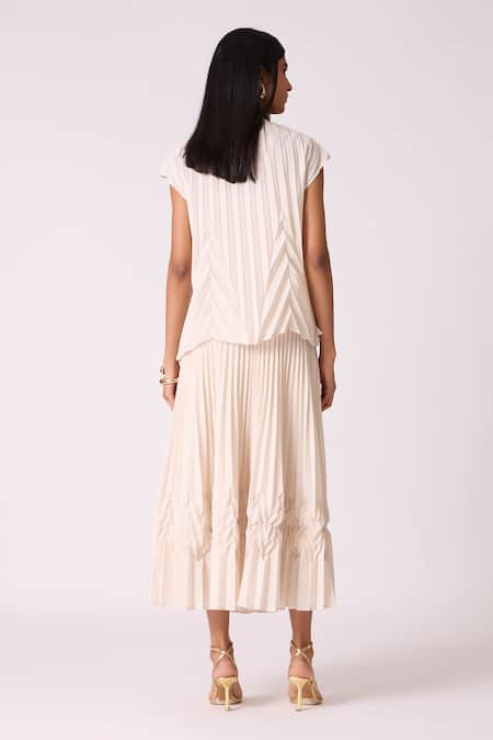An off white poly-linen-blend top featuring accordion pleats with chevron 3D pleats. It is paired with an off white poly-linen-blend accordion pleated skirt with a godet arrangement at the hem.