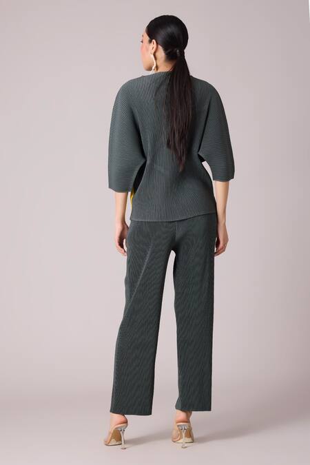 Slate green top featuring an abstract print with pleated texture and long sleeves. Paired with straight fit pants that have side pockets.