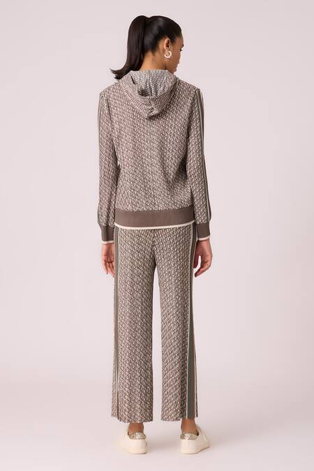 Brown floral printed top featuring a hooded neckline, pleats, and front pocket detailing. Paired with coordinating floral print wide-leg pants.