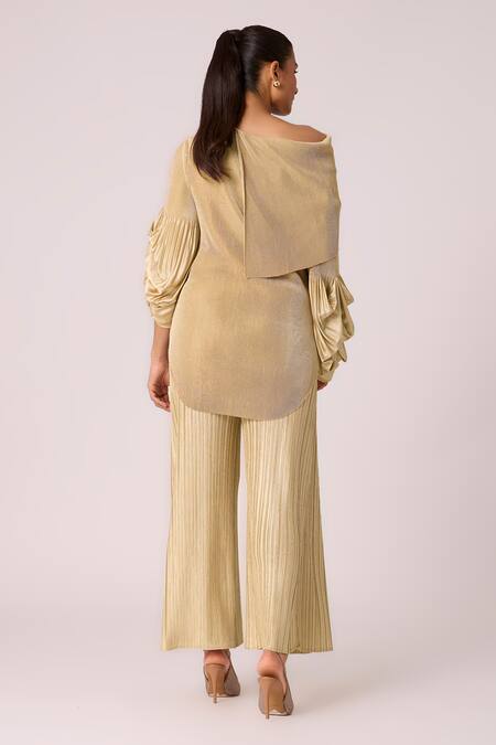 Champagne asymmetric top featuring flap one shoulder detailing with pleat detailing. Paired with pleat detailed pant and a waist belt.