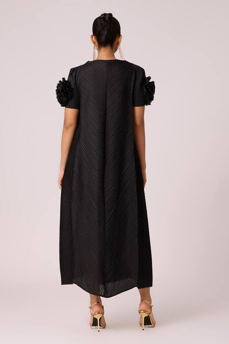 Black A-line dress featuring pleat detailing and 3D roached flowers on the sleeves