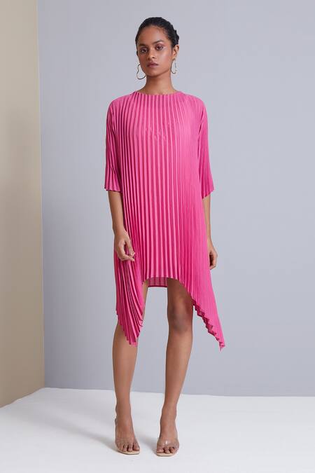 Pink 100% Polyester Round Sybil Pleated Asymmetric Tunic
