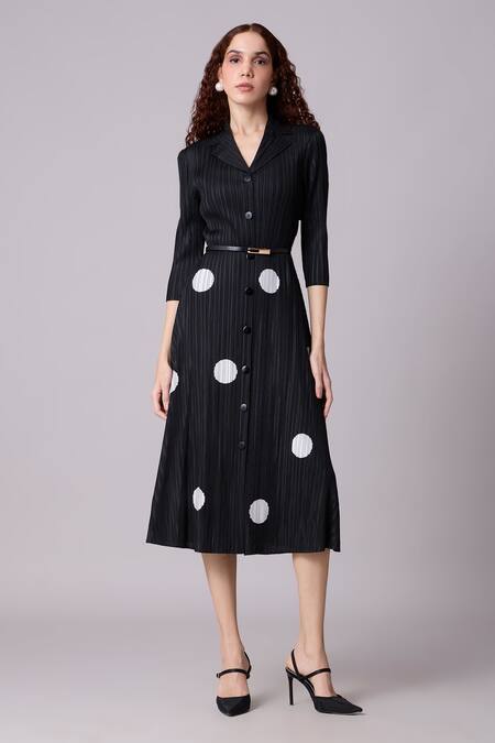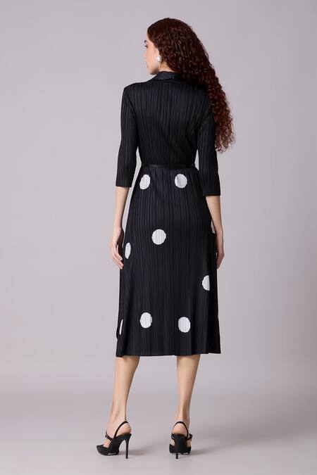 Black pleated midi dress featuring a lapel collar and three-quarter sleeves. Comes with a leather belt and has a structured asymmetrical hem line with polka dot print.