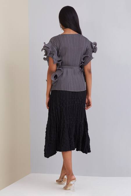Black mermaid silhouette skirt with flounce hem & 3D pleated fabric.