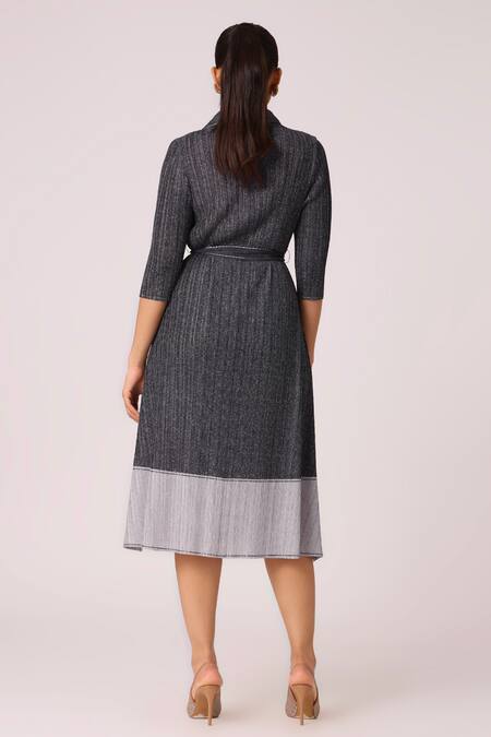 Contrast panel detailing on the dress, Front placket with buttons, Waist belt included