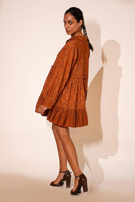 Orange dress featuring schiffli pattern, spread collar neckline, and full sleeves