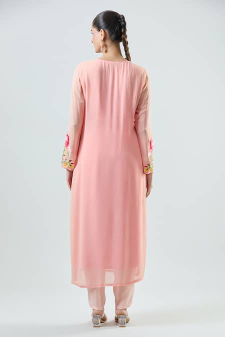Buy_Seams Pret And Couture_Pink Georgette, Silk, Satin Embroidery Round Neck Alice Ari Kurta Pant Set _Online_at_Aza_Fashions