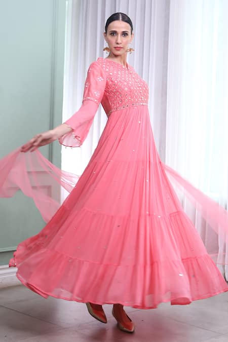 Buy_Seams Pret And Couture_Pink Georgette Embroidered Mirror Work V Neck Ananya Anarkali With Dupatta _Online_at_Aza_Fashions