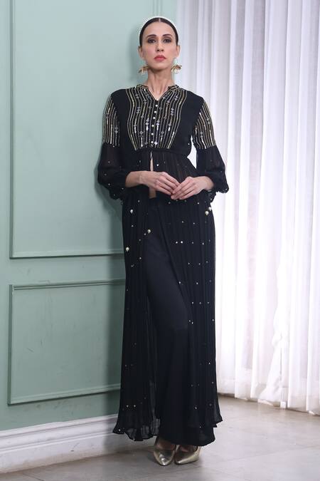 Black embroidered kurta in mirror and sequin work with sheer panel. Paired with solid palazzo.