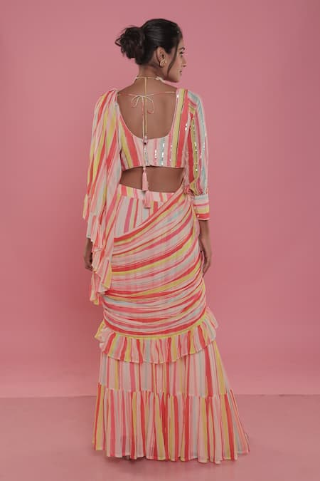 Multicolor pre-draped saree with striped pattern. Paired with sequin embroidered blouse.