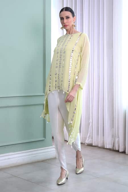 Lime green asymmetric kurta with hand embroidered leather applique. Paired with dhoti pant.