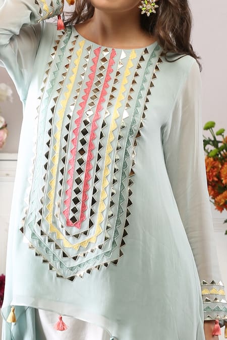 Aqua blue asymmetric kurta in embroidered leather & applique work. Paired with tulip pant.