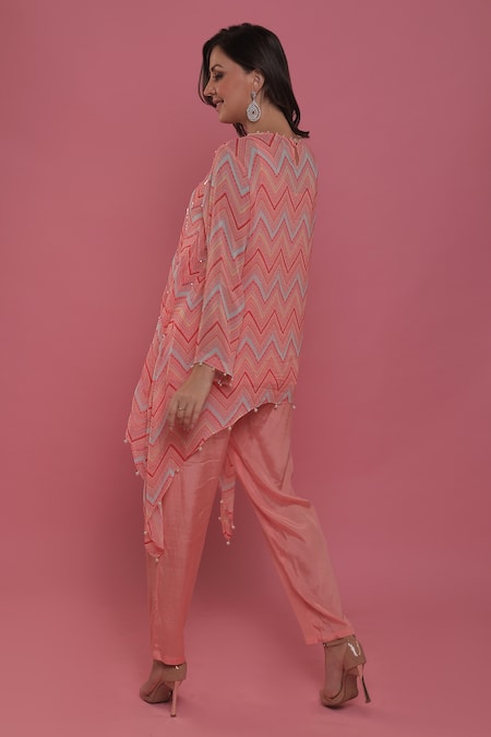 Seams Pret And Couture_Pink Georgette And Shantoon Print & Embroidery Chevron Sandra Tunic & Pant Set _Online_at_Aza_Fashions