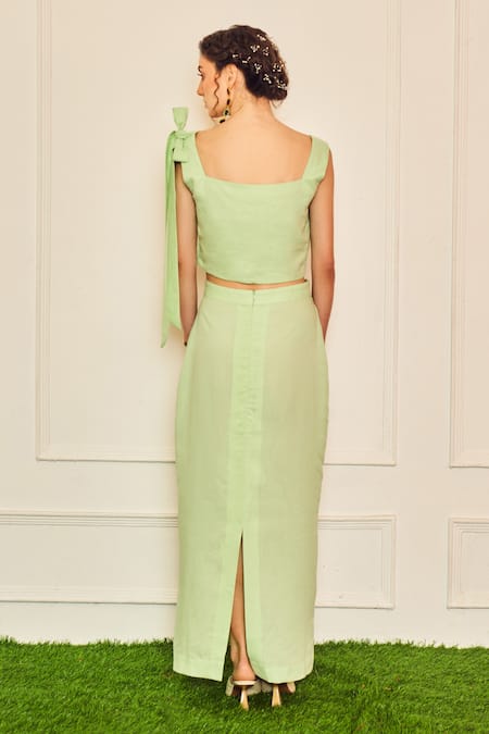 Mint green one-shoulder crop top featuring a square neckline and a bow on the shoulder. Paired with a coordinating midi skirt with a back slit.