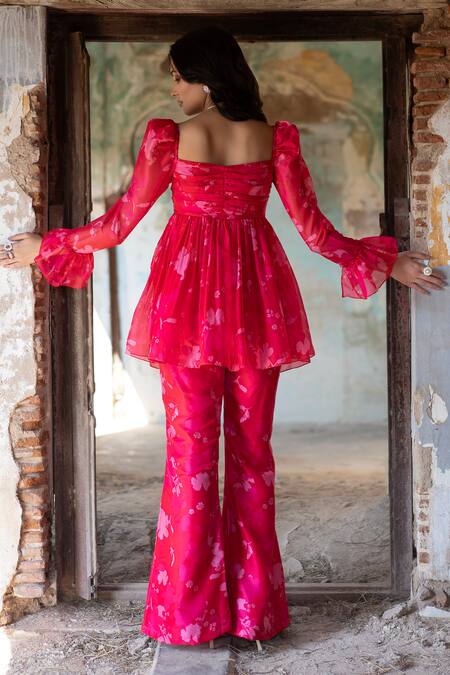 Peony pink tunic featuring a sweetheart neckline, leg of mutton sleeves, and a back square neck. Paired with flared pants, both adorned with a vibrant bagh print.