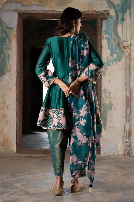 Emerald green short anarkali featuring bagh placement print and gota embroidered border. Paired with tulip pant and sheer printed dupatta with tassel embroidered lace hem.