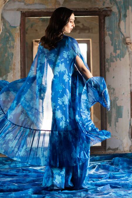 Sapphire blue bustier with V neck and sleeveless design. Paired with a tiered sharara and an open cape featuring flared sleeves, adorned with intricate bagh print and embellishments.