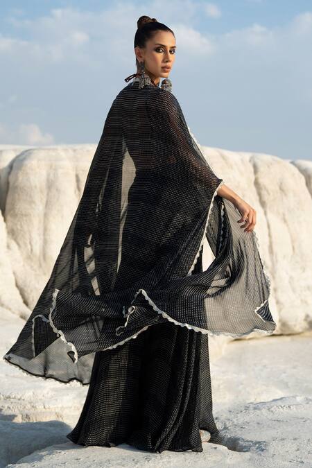 Black cape with safar print and cutdana and bead embroidery on the border. Comes with sequin and bead embroidered strappy padded blouse and flared sharara.