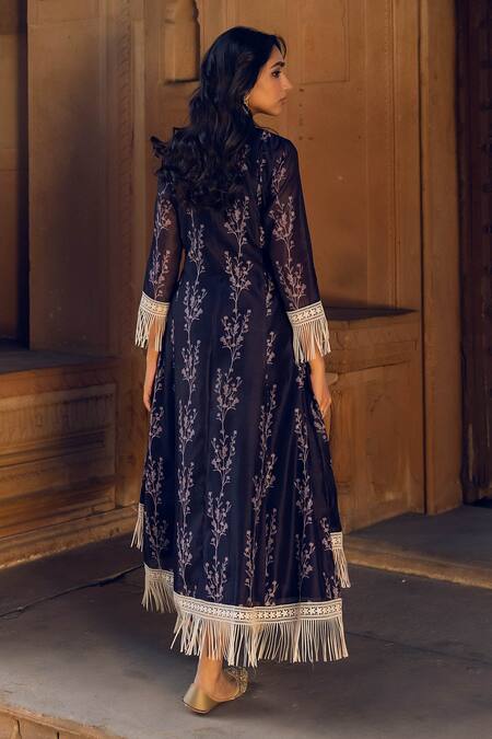 Frill neckline, Front button placket, Printed motifs, Fringe hem with lace work, Asymmetric kurta