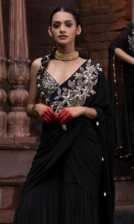 Black pre-draped sharara saree featuring floral sequin embellished patterns. Accompanied by a padded blouse with bead, mirror, and sequin embellishments.