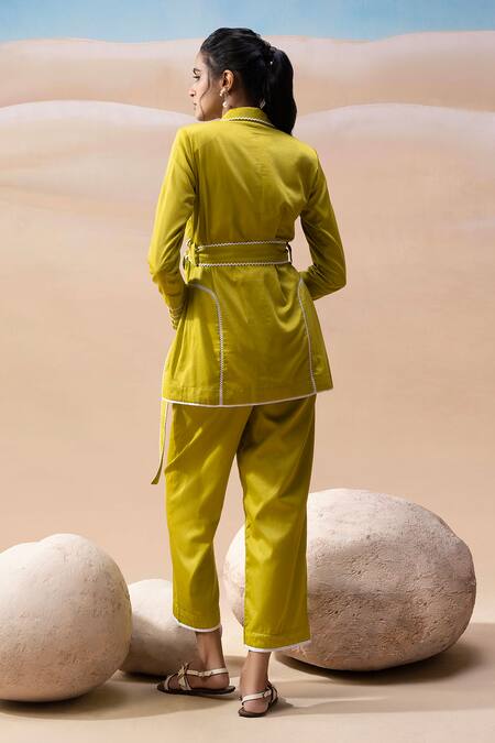 Green Cotton Satin Embellished Lace Lapel Zig Zag Wave Wrap Blazer With Pant