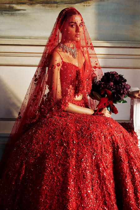Red Net Sequins, Crystals Plunge Neck 3d Floral Embroidered Bridal Lehenga Set