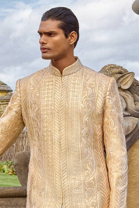 Rose gold sherwani featuring lurex ribbon embroidery in an abstract pattern. Paired with a matching kurta and dhoti salwar.