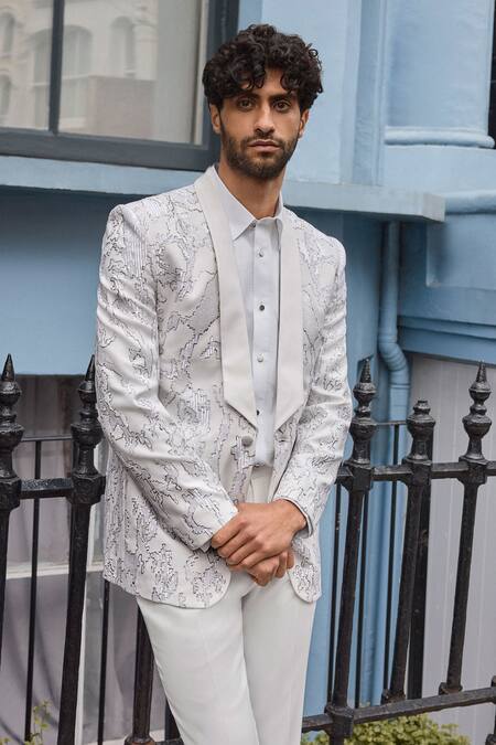Ivory tuxedo jacket featuring abstract embroidery in silver and ivory metal thread with a single-buttoned shawl satin lapel. Paired with a crisp white pintucked shirt and matching straight pant.
