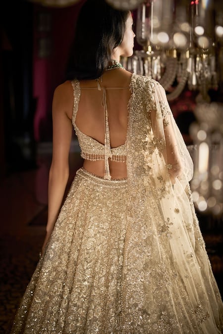 Back tassel tie-up on blouse, Crystal drops on blouse hem, Scallop embroidered borders on dupatta