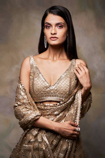 Dusty gold sheer saree with all-over coffee-tone sequin work in a geometric pattern. Paired with embroidered blouse.