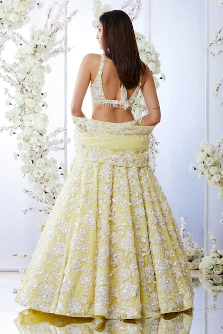 Lime yellow lehenga features all-over assorted sequins in floral embroidery on net base. Paired with sleeveless embroidered blouse & embroidered net dupatta.
