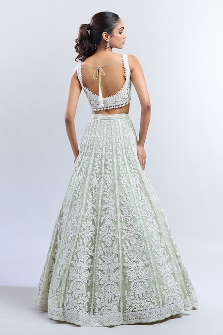 Light pistachio green lehenga featuring intricate floral and leaf vine embroidery. Paired with a coordinating embroidered padded blouse and scalloped border dupatta.