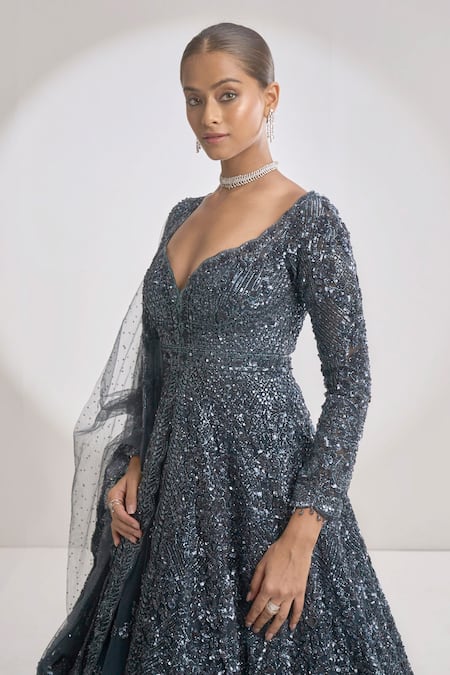 Charcoal grey attached can-can lehenga features all-over tonal sequin, bugle beads & crystal embroidery. Paired with jacket that has tassel beads in cuffs. Comes with a matching dupatta.