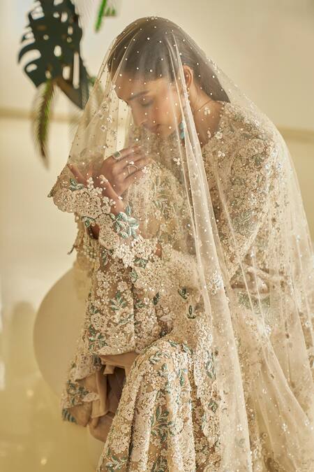 Beige kurta featuring thread embroidered floral pattern embellished with sequins and pearls. Paired with a matching sharara and dupatta, adorned with pearl tassels and cut-out borders.