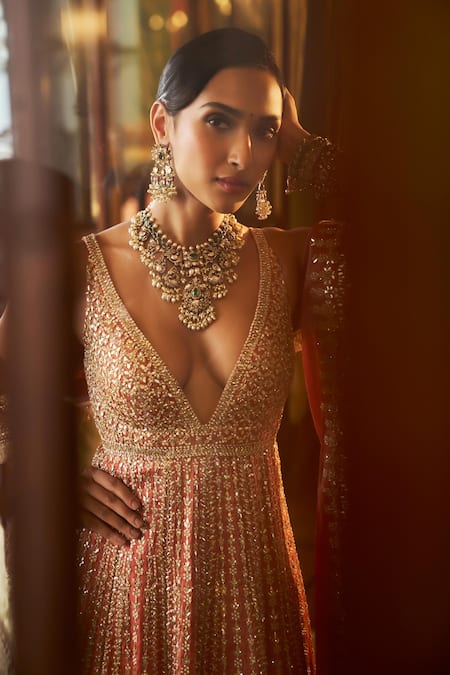 Orange Tissue, Silk Beads, Sequins, Gota Linear Embroidered Anarkali Sharara Set