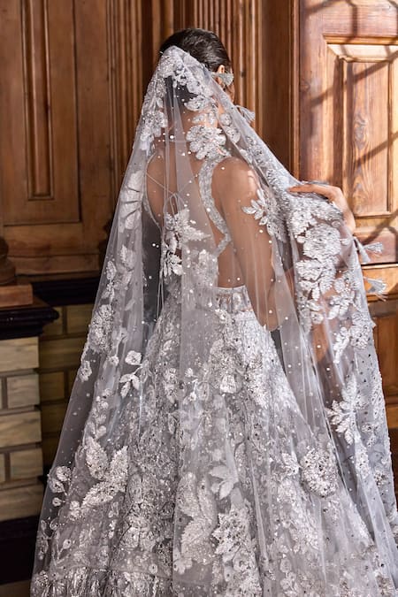 Silver Net Crystals, Sequins, Embroidery Metallic Flower Bridal Lehenga Set